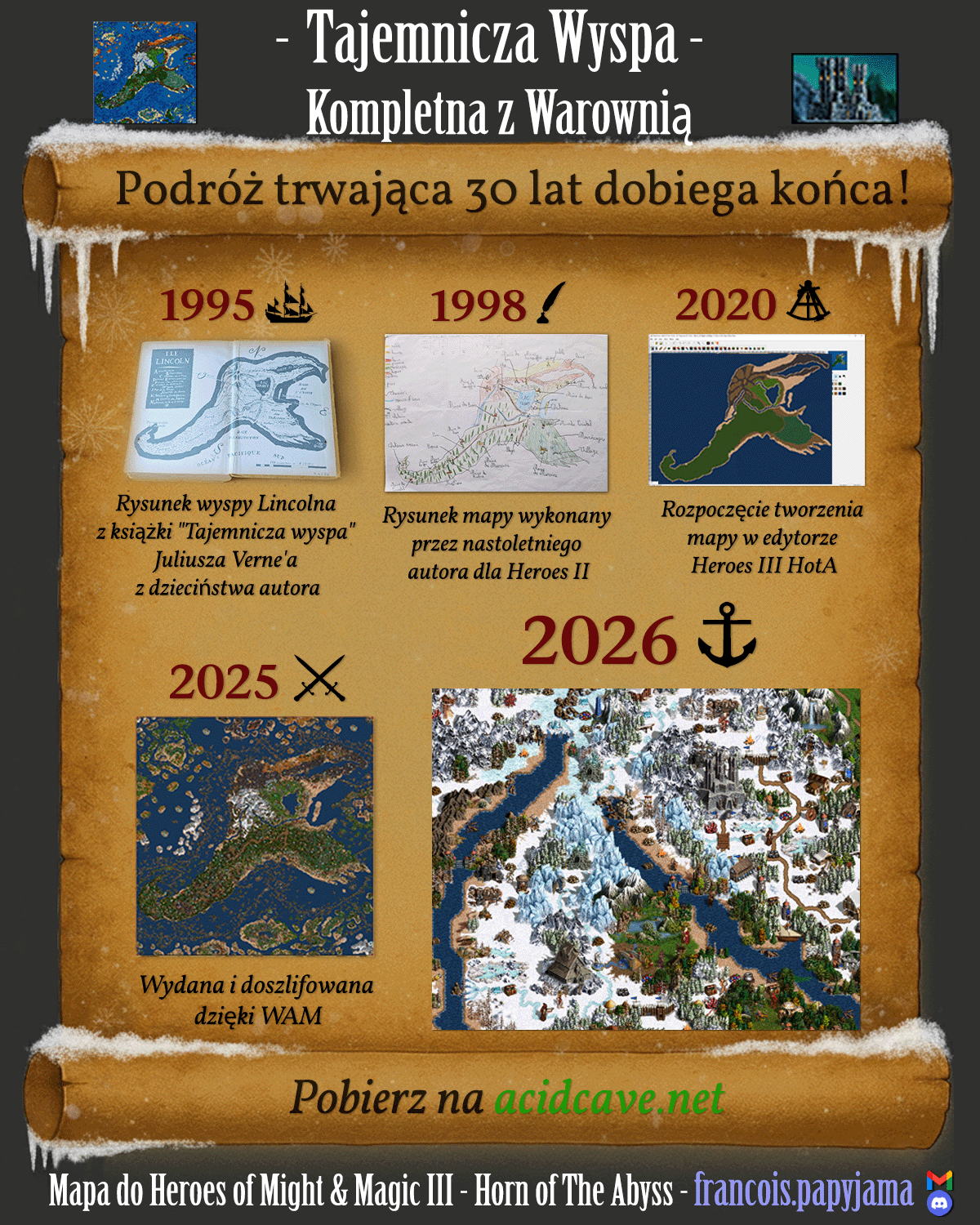 W tym miesiącu swoją premierę miała najnowsza wersja prawdopodobnie najobszerniejszej mapy do Heroes III HotA. Całość była tworzona przez wiele lat, od rysunkowej koncepcji z lat młodości autora po Warownię dodaną w ostatniej aktualizacji. Mapka jest bazowana na wyspie Lincolna z powieści Juliusza Verne'a. Warto ją przetestować nawet jeśli nie znacie fabuły tej książki, niemniej jej czytelnicy wyłapią więcej smaczków. Papyjama przygotował dodatkowo specjalną wiadomość (wyświetlaną pierszego dnia) dla polskich graczy oraz grafikę promocyjną. W pakiecie poniżej znajduje się wersja mapki z sojuszem i solo.